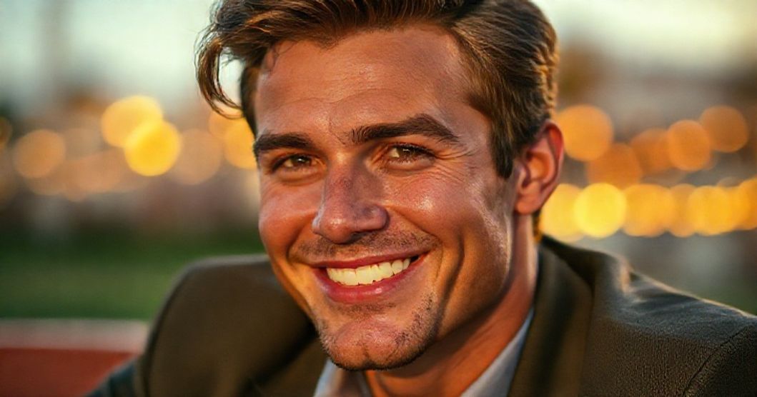 Classic Looks He looks like a movie star from another era—square jaw, all-American, approachable.